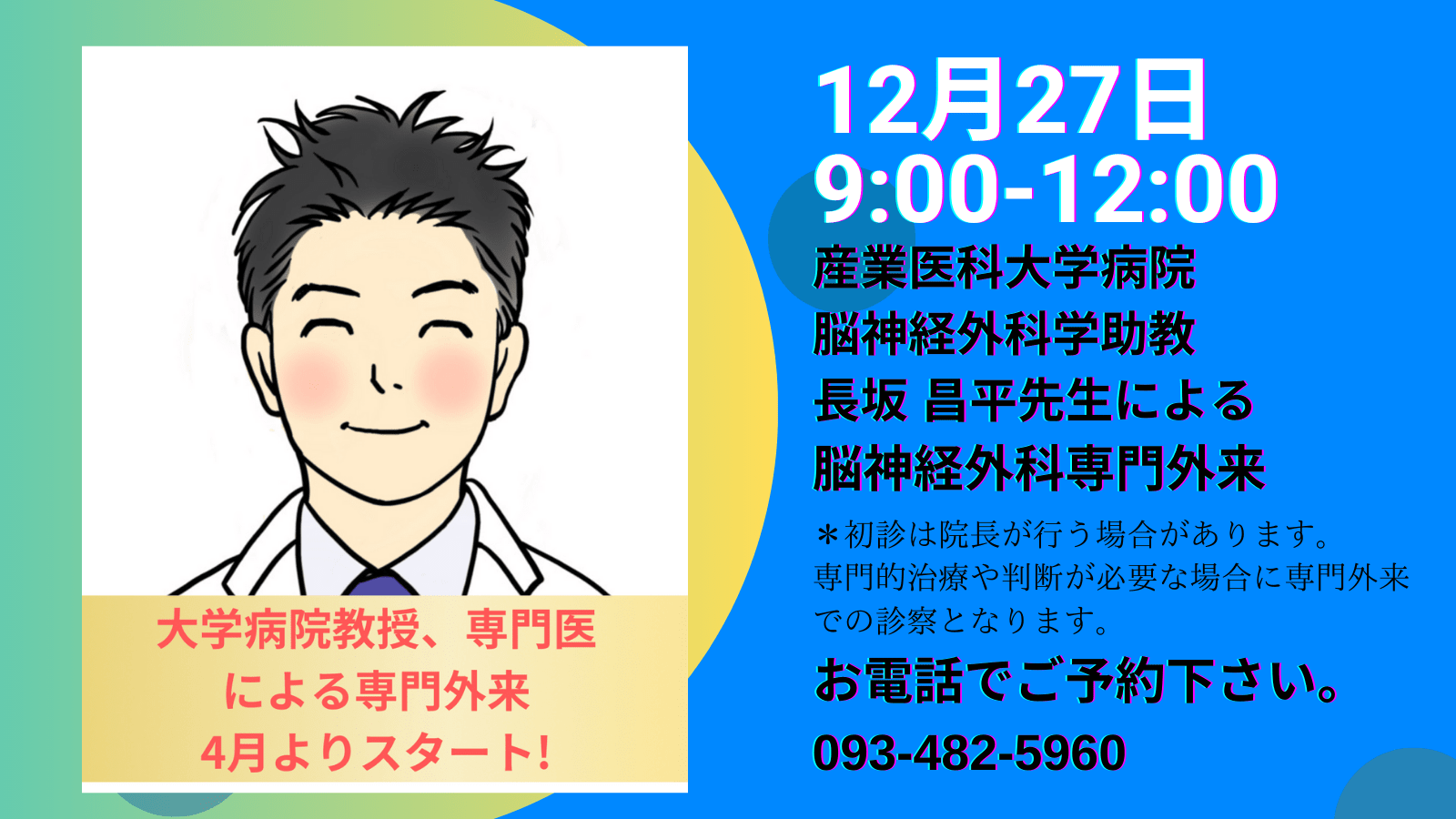 12月27日土曜日 産業医科大学病院脳神経外科専門医による専門外来(2診体制)