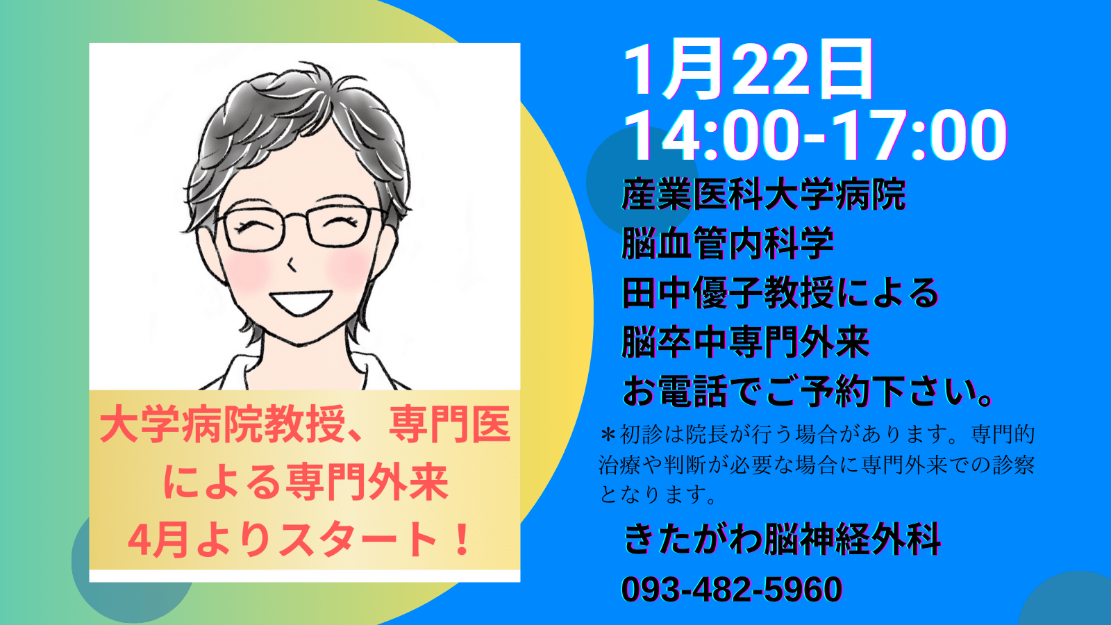 1月22日木曜日 産業医科大学脳血管内科学教授による専門外来(2診体制)
