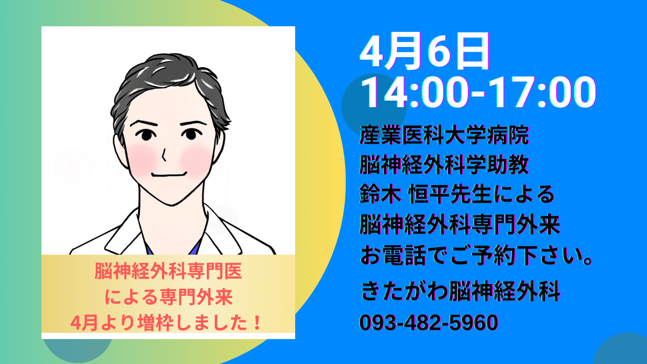 4月6日土曜日 産業医科大学病院脳神経外科専門医による専門外来(2診体制)4月より増枠しました