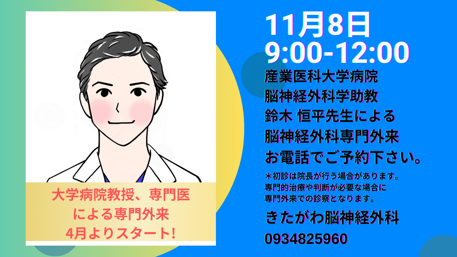 11月8日土曜日 産業医科大学病院脳神経外科専門医による専門外来(2診体制)