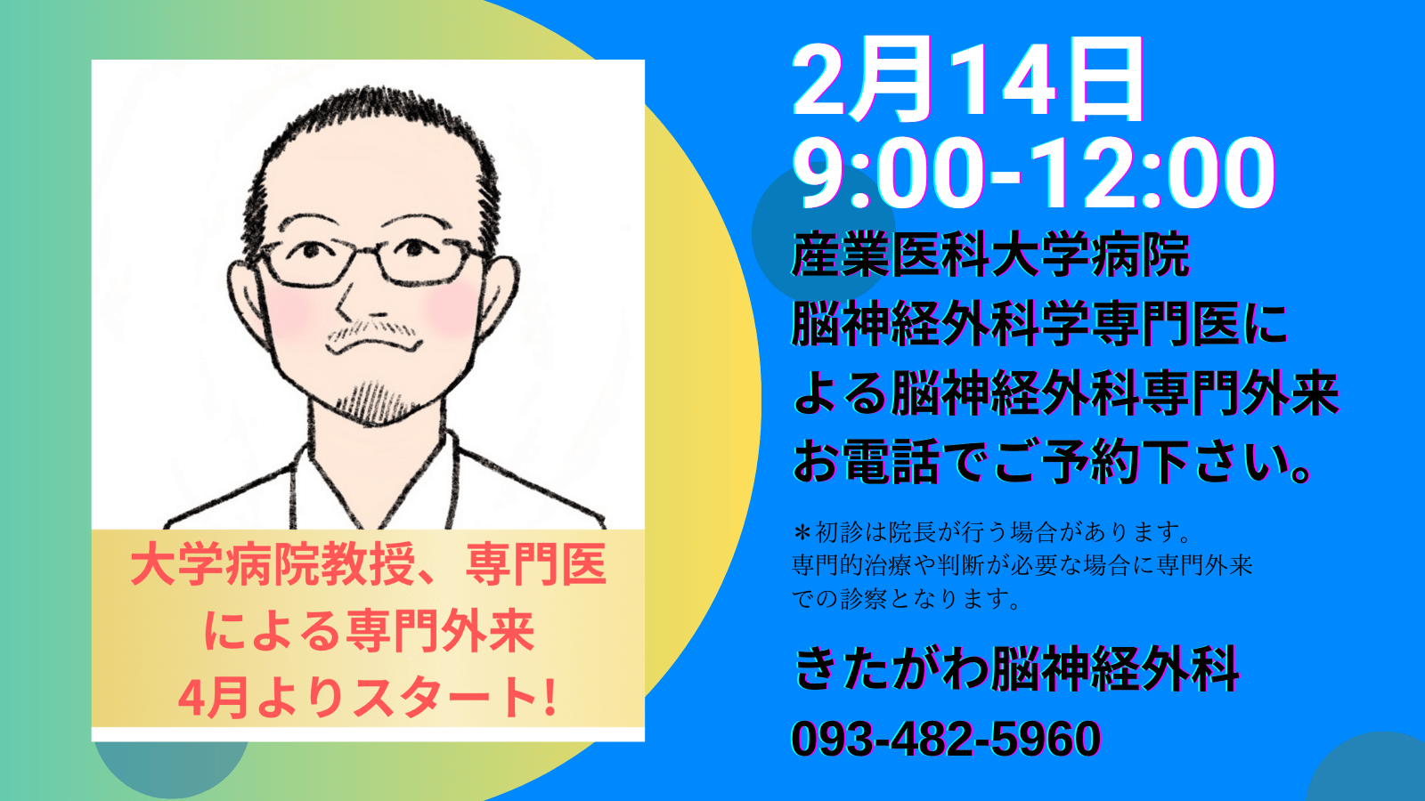 2月14日土曜日 産業医科大学病院脳神経外科専門医による専門外来(2診体制)
