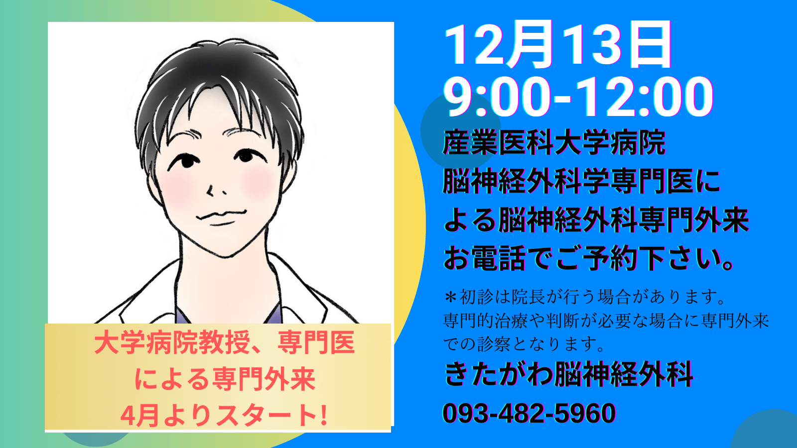 12月13日土曜日 産業医科大学病院脳神経外科専門医による専門外来(2診体制)